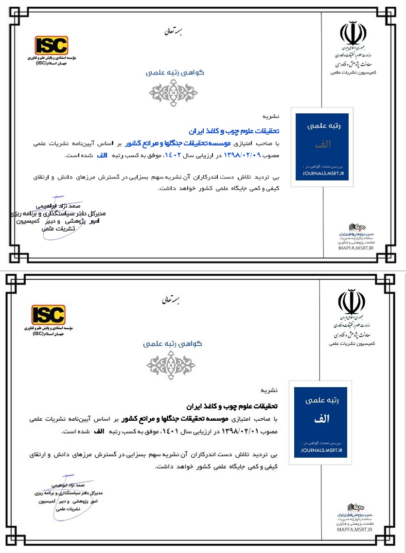 The journal "Iranian Wood and Paper Science Research" has been published by the National Forest and Rangeland Research Institute since 1995 in Persian, with a quarterly publication frequency and an open access print-electronic format. This journal reviews all articles through anonymous peer-review and in the final review process uses Hamyab plagiarism detection software to detect the originality of articles. In addition, this journal is not a member of the International Committee on Ethics in Publication COPE, but it follows its principles. The journal "Iranian Wood and Paper Science Research" receives the latest findings and results of research conducted in various fields of wood and paper industries (biology and protection of wood, wood modification, wood products and wood composites, nanotechnology in wood and paper sciences, pulp and paper technology, chemical processing of wood, economics and marketing of wood products and all industrial and technical issues related to the wood and paper industry, etc.) in the form of scientific articles and examines them for publication. (More information)